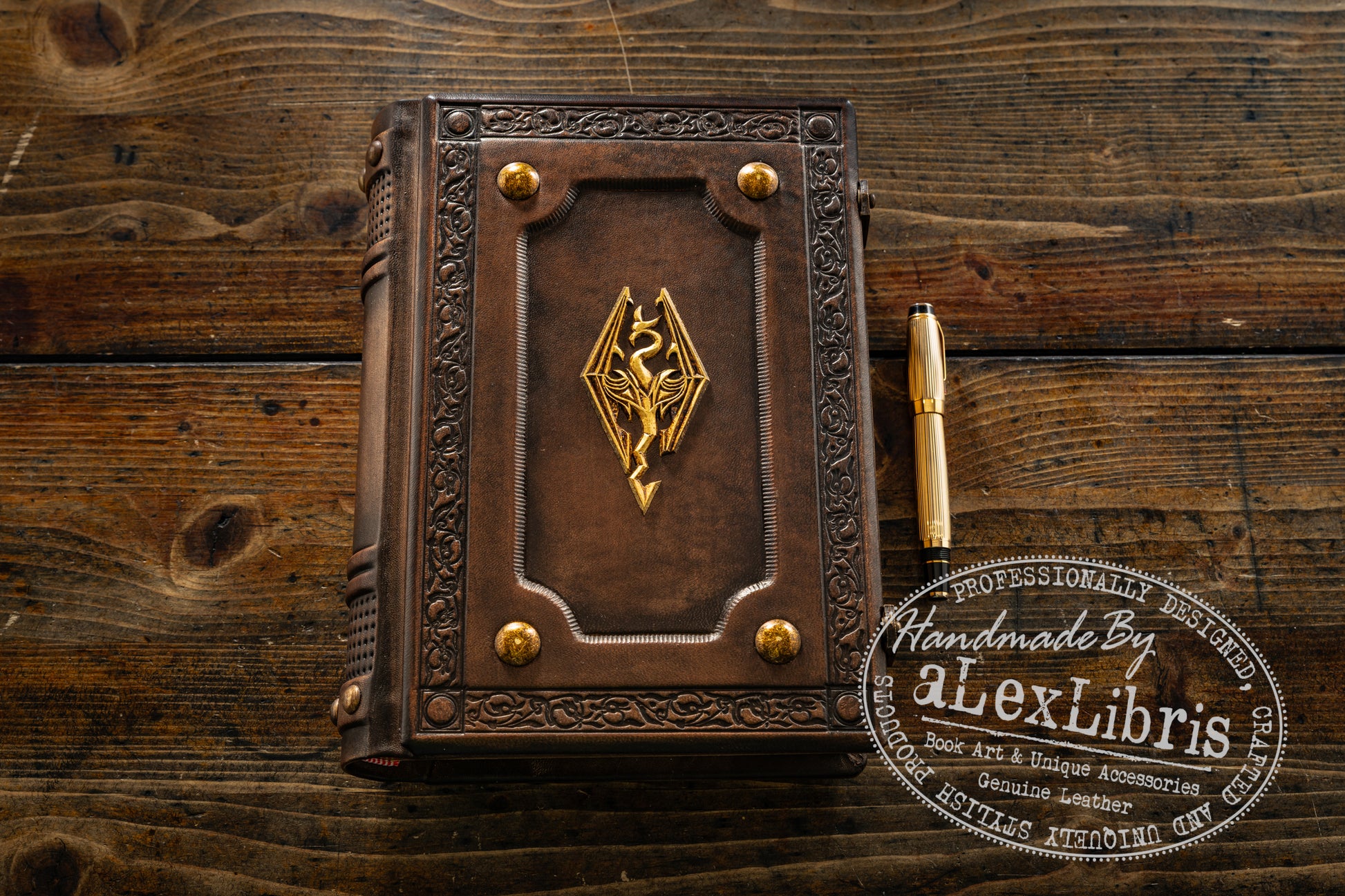 The journal measures 7.5" x 10" (25.2 x 19 cm) in size, providing ample space for your writings, and boasts a thickness of approximately 3 inches (8 cm). The front cover plate showcases a hand-carved Skyrim. Along the book spine are tightened patterned leather straps, placed between delicate ribs and metal pins. The leather undergoes a careful process of hand toning and aging, resulting in a rich spectrum of brown color tones.