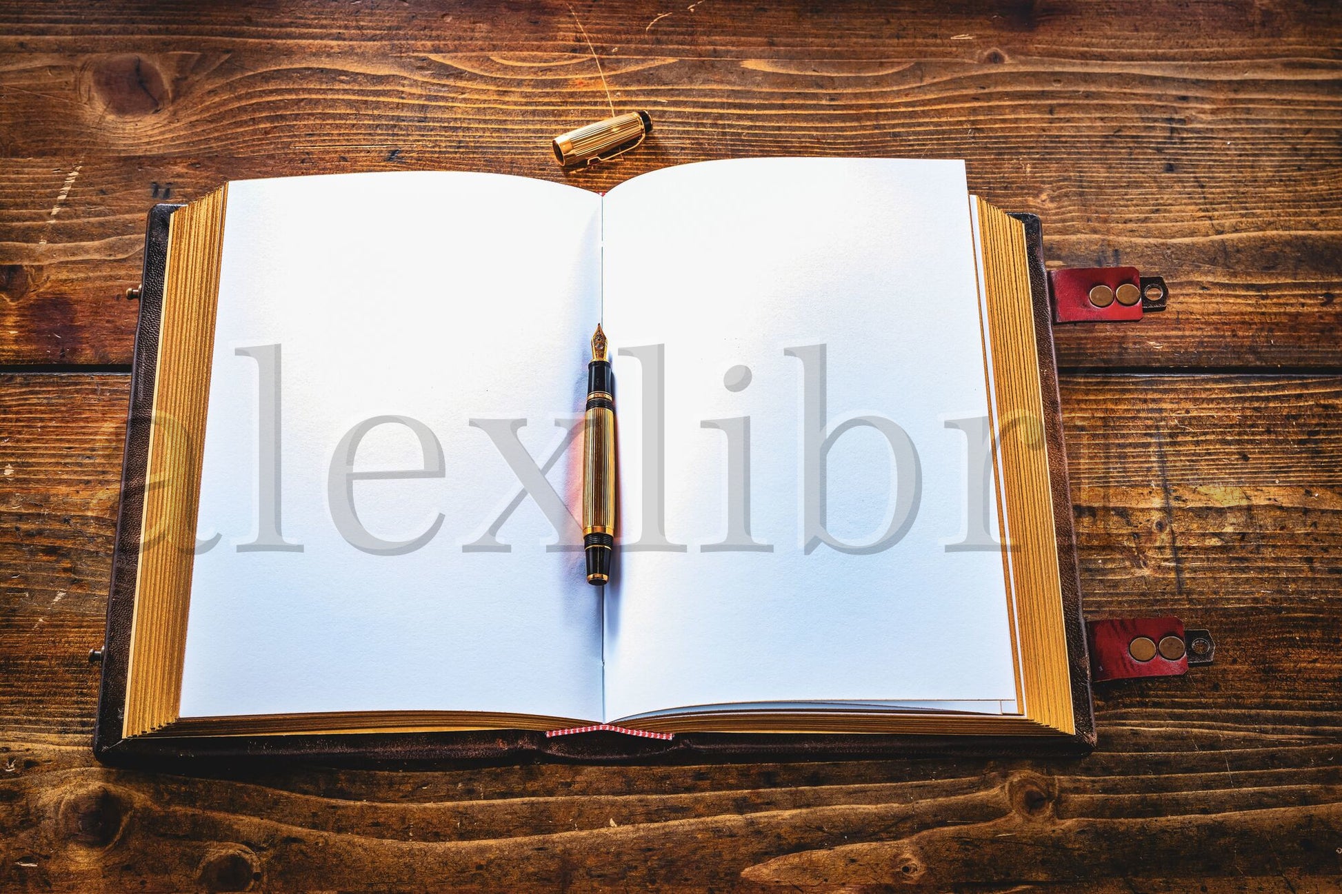 The book block consists of 300 leaves (600 pages) of 140 gsm weight, blank white paper. The paper is sourced from the renowned Italian company Fedrigoni, known for its high-grade quality. It is designed to prevent bleed-through and offers an exceptionally smooth writing surface. The inside cover-endpapers showcase marbled parchment, adding an elegant touch. The gilded and aged paper edges contribute to the overall authentic vintage aesthetic.