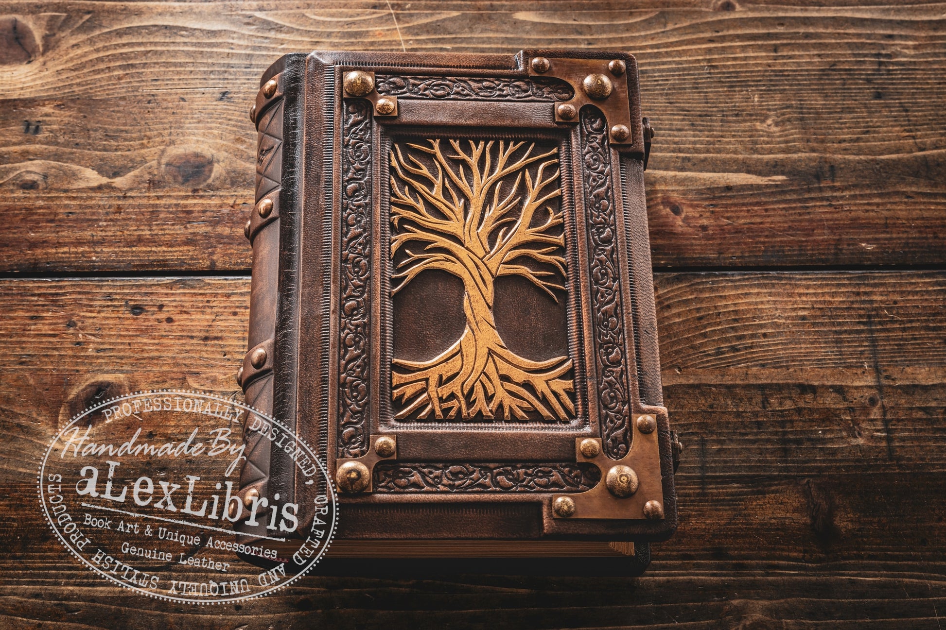 The journal measures 8" x 10" (26 x 20 cm) in size with a thickness of approximately 3 inches (8 cm). The front cover features a recessed central part, surrounded by an embossed frame and accented with handmade brass corners. The centerpiece, the Tree of Life, is meticulously hand-carved from thick leather, hardener with specialized bookbinder mixtures, carefully gilded and aged.